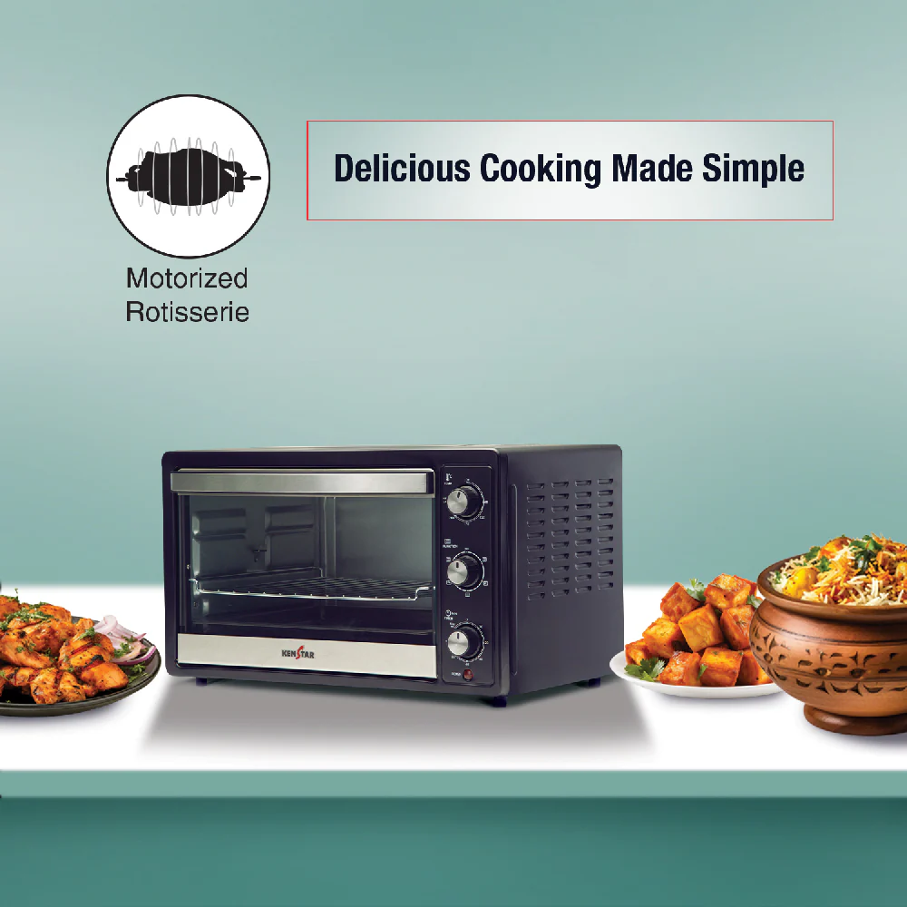 Elevate your cooking with our 1800W, 30L capacity OTG. The 60-minute timer and versatile cooking options, including a motorized rotisserie and convection function, ensure precision and variety. The inner lamp, crumb tray, food tray, grilling rack, and user-friendly mechanical control knob enhance your cooking experience. Backed by a 2-year warranty, this appliance promises durability and reliability for your culinary adventures.