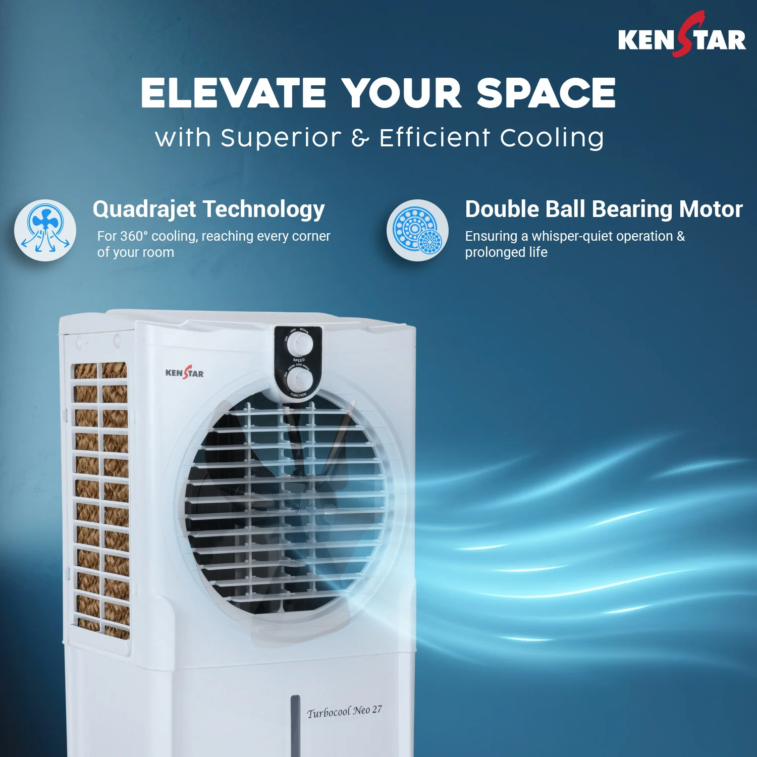 Turbocool New 27 air cooler delivers 2200 cubic meters of air per hour and features honeycomb cooling pads for superior performance. It's inverter compatible and has an 30 cm large and powerful fan, consuming only 110 watts. With a dust net filter and ice chamber, it ensures clean and cool air. Ideal for bedrooms, halls, balconies, rooftops, and lawns.